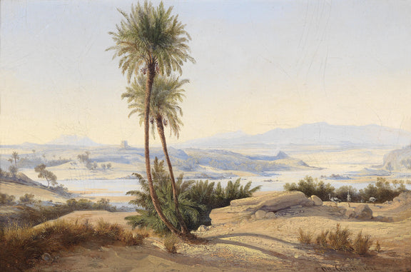 Hand-painted desert landscape oil painting featuring palm trees, riverbanks, and distant hills. A timeless canvas artwork for elegant home decor.