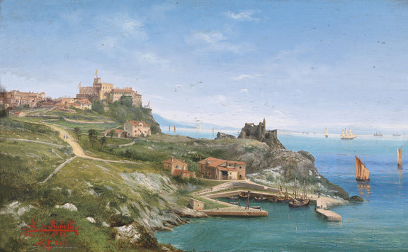 A hand-painted oil painting of a coastal village harbor with boats, cliffs, and blue sea, ideal for classic home décor.