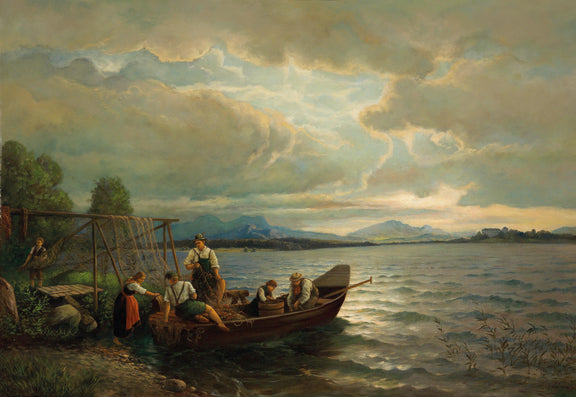 A hand-painted European oil painting showing fishermen working by a calm lake at dusk, dramatic clouds, soft light, and classic rural atmosphere.