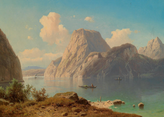 This traditional oil painting depicts an alpine lake: steep rock peaks, calm waters, boats, shore vegetation & a bright sky—serene natural scenic charm in classic style.