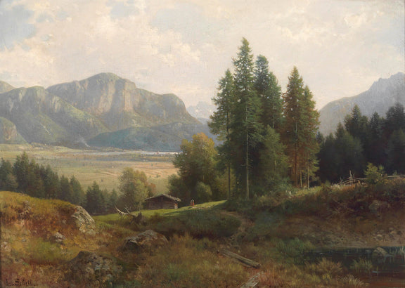 This traditional oil painting shows an Alpine valley: tall pines, log cabin, distant town, mountain range & small figure—serene natural charm in classic style.