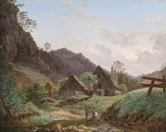 This oil painting shows a mountain valley scene: a rocky stream in the foreground, rustic log cabins mid-ground, and forested rocky peaks under a cloudy sky. Its tranquil vibe suits rural mountain-themed decor.