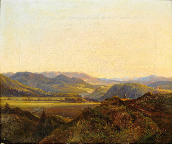 This traditional mountain valley landscape oil painting shows a shepherd with sheep, a church, rolling hills & golden hour light—serene rural charm in classic landscape art.