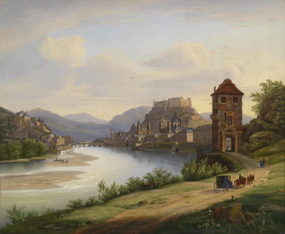 Landscape Oil Painting - Riverfront Town & Hilltop Castle: Carriage
