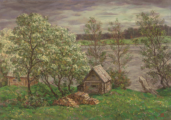 Landscape Oil Painting - Spring Rural, Blossoming Trees, Cabins & River