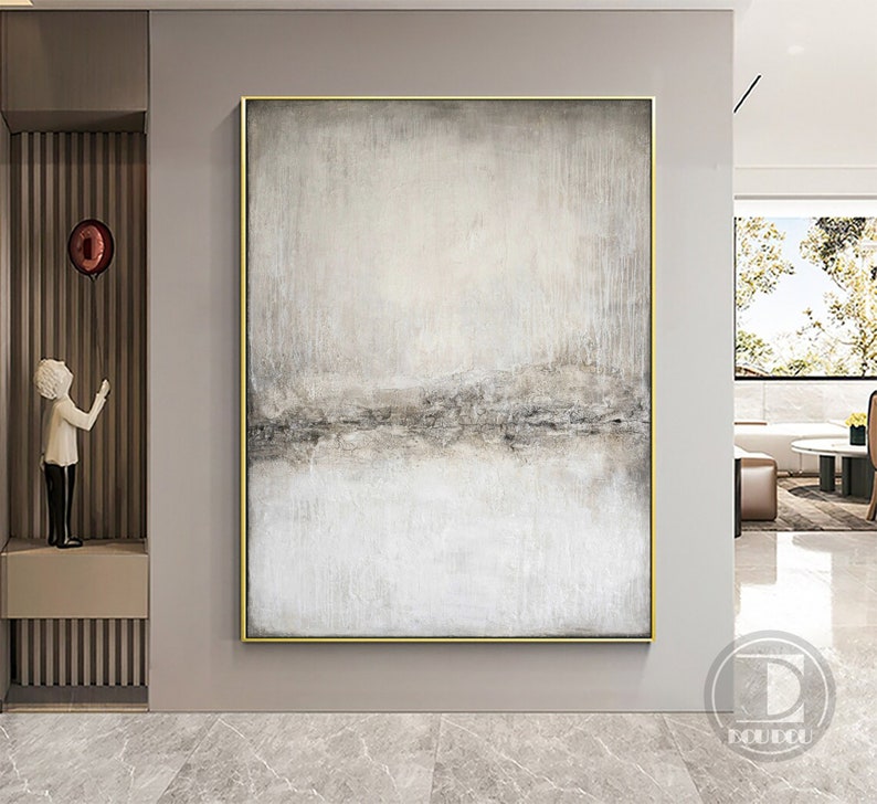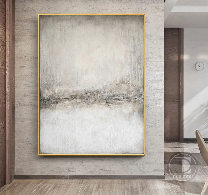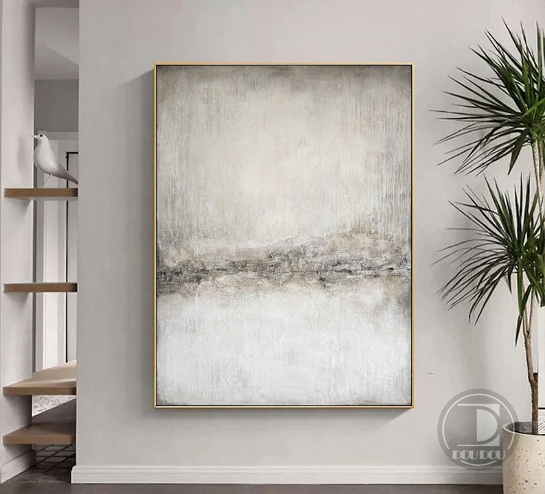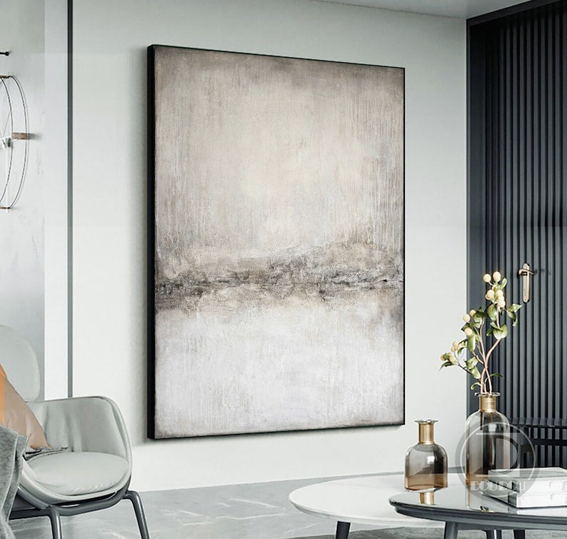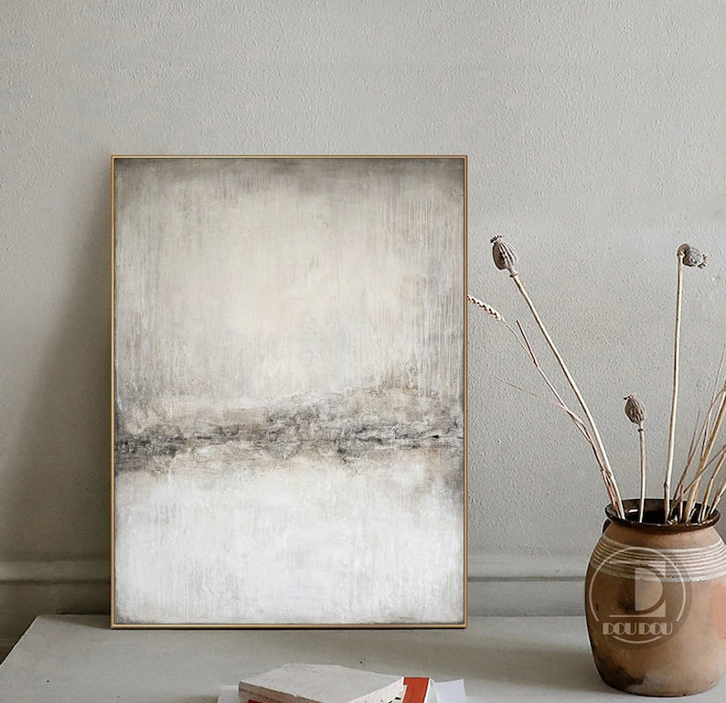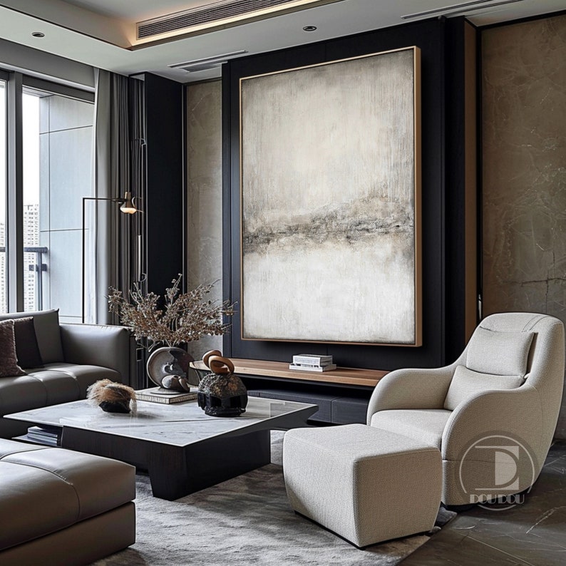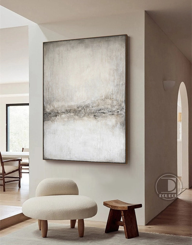 Abstract Oil Painting featuring soft neutral tones and textured brushwork. Creates a calming minimalist aesthetic perfect for modern living room decor and elegant interior spaces.
