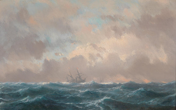 Ocean Seascape Oil Painting with Distant Sailing Ship, Hand-Painted