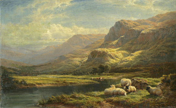 Hand-painted pastoral landscape oil painting of sheep resting by a mountain lake. A serene countryside canvas artwork for timeless home decor.